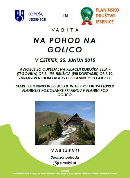 25. 6. 2015 / Pohod, ogledov: 2246Pohod na Golico | Vrsta dogodka | Pohod | Območje | Julijske Alpe | Kdaj | 25. 6. 2015 8:00, izpred trgovine v Koroški Beli, 8:10 Pri Kopitarju na Hrušici | Društvo | Planinsko društvo Jesenice | Organizator | Občina Jesenice | Pot | Označena pot | Primernost | Primerno za družine |