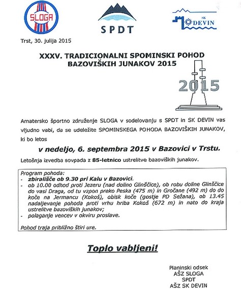 6. 9. 2015 / Pohod, ogledov: 242235. tradicionalni spominski pohod bazoviških junakov 2015 | Vrsta dogodka | Pohod | Območje | Italija | Kdaj | 6. 9. 2015 9:00 pri Kalu v Bazovici | Kje | Bazovica | Društvo | Slovensko planinsko društvo Trst | Organizator | AŠZ Sloga, AŠZ SK Devin | Primernost | Primerno za družine | Dogodek je del projekta Slovenija planinari, ki ga izvajata Planinska zveza Slovenije in Olimpijski komite Slovenije. |