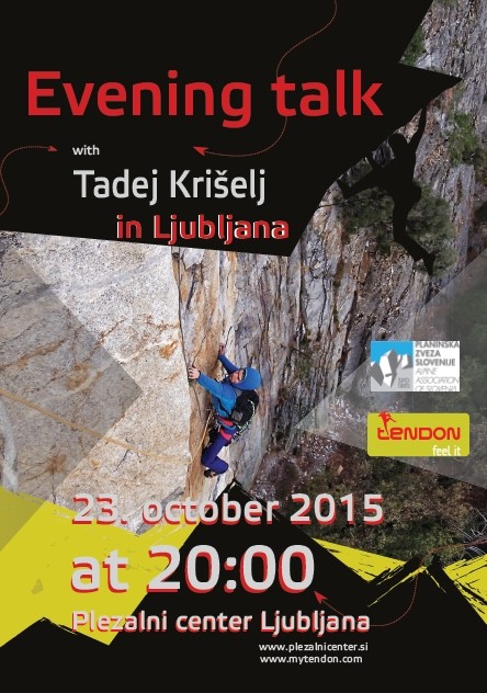 23. 10. 2015, ogledov: 1546Evening talk with Tadej Krišelj | Kdaj | 23. 10. 2015 19:00, Plezalni center Ljubljana | Kje | Ljubljana |