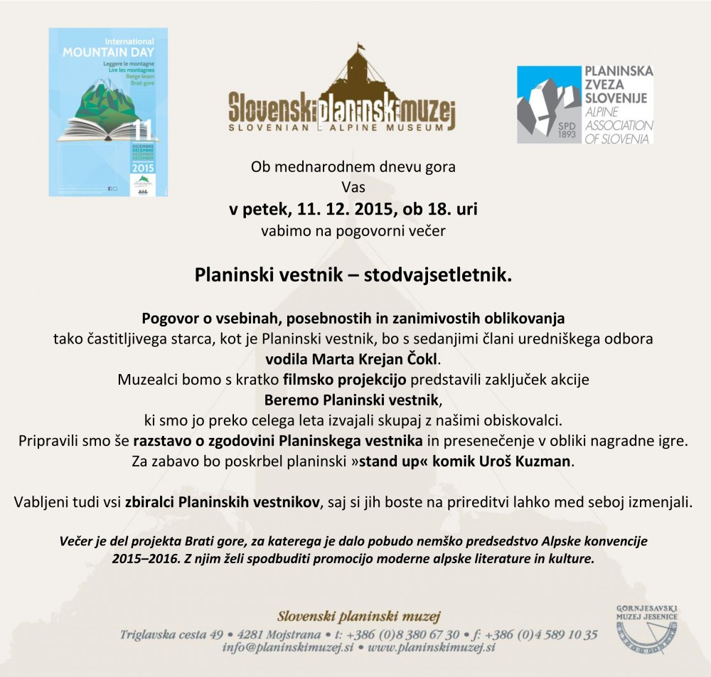 Letos praznujemo 120-letnico izhajanja najstarejše slovenske planinske revije. V Slovenskem planinskem muzeju smo zato celo leto skupaj z našimi obiskovalci izvajali projekt Beremo Planinski vestnik. Vsak mesec smo posneli obiskovalce, ki so prebrali deset odlomkov iz preteklih letnikov, posnetke pa smo objavili na naši spletni strani. Na posebni prireditvi ob 18. uri bomo predstavili izbor posnetkov in zaključili projekt. Istočasno bi radi povabili vse zbiralce Planinskega vestnika, da nas obiščejo in si med seboj izmenjajo manjkajoče številke. Nekaj odvečnih bomo pripravili tudi muzealci.