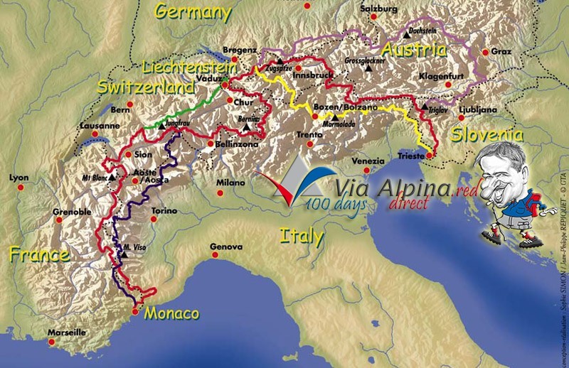prehodil rdečo pot Via Alpina od Monte Carla do Trsta. Ta epski pohod ga