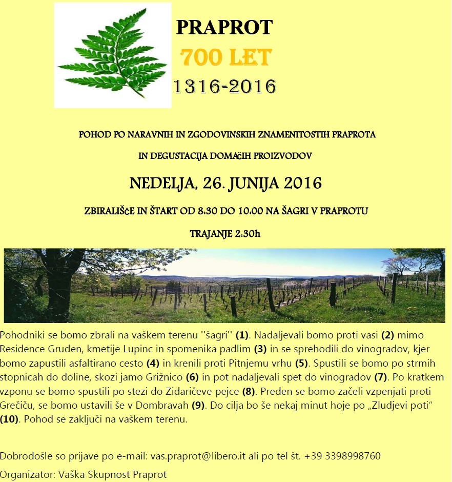 26. 6. 2016, ogledov: 1562Pohod po znamenitostih Praprota in degustacija domačih dobrot | Kdaj | 26. 6. 2016 8:30, Šangra pri Praprotu | Organizator | Vaška skupnost Praprot |