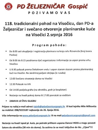 118. tradicionalni pohod na Visoćico in dan PD Željezničar Gospić | Vrsta dogodka | Srečanje | Kdaj | 2. 7. 2016 | Organizator | PD Željezničar Gospić |