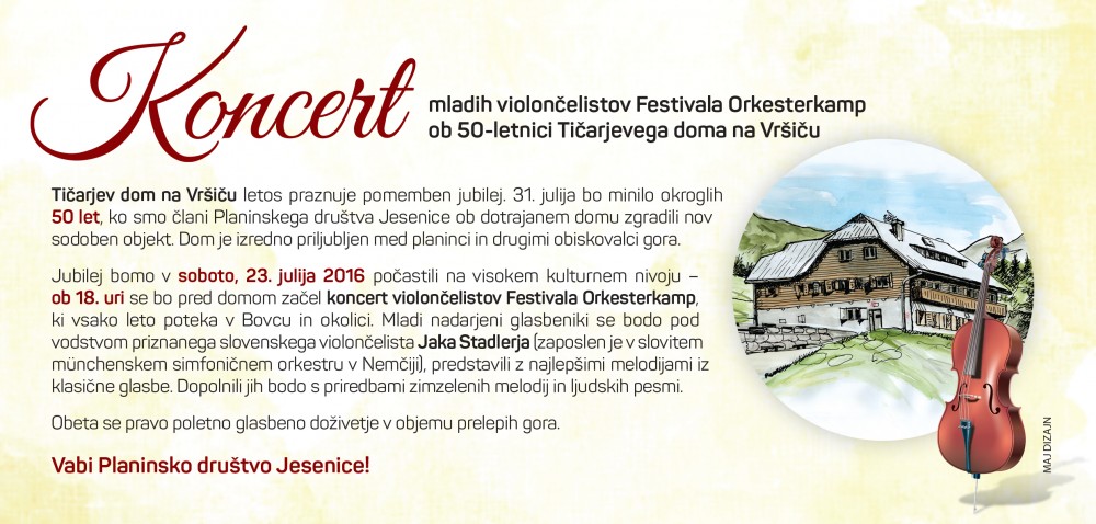 Tičarjev dom na Vršiču je izredno priljubljen med planinci in drugimi obiskovalci gora. Jubilej bomo v soboto, 23. julija 2016, počastili na visokem kulturnem nivoju. Ob 18. uri se bo pred domom začel koncert violončelistov Festivala Orkesterkamp, ki vsako leto poteka v Bovcu in okolici. Mladi nadarjeni glasbeniki se bodo pod vodstvom priznanega slovenskega violončelista Jake Stadlerja (Münchenski simfonični orkester v Nemčiji), predstavili z najlepšimi melodijami iz klasične glasbe. Dopolnili jih bodo s priredbami zimzelenih melodij in ljudskih pesmi.