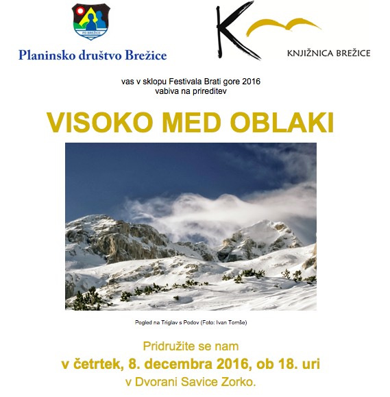 Festival Brati gore 2016: Visoko med oblaki | Vrsta dogodka | Kulturna prireditev | Kdaj | 8. 12. 2016 18:00 | Kje | Knjižnica Brežice - Dvorana Savice Zorko | Društvo | Planinsko društvo Brežice | Organizator | Knjižnica Brežice | Povezava | http://www.knjiznica-brezice.si/bralnik/festival-brati-gore-2016-visoko-med-oblaki-1536.html |