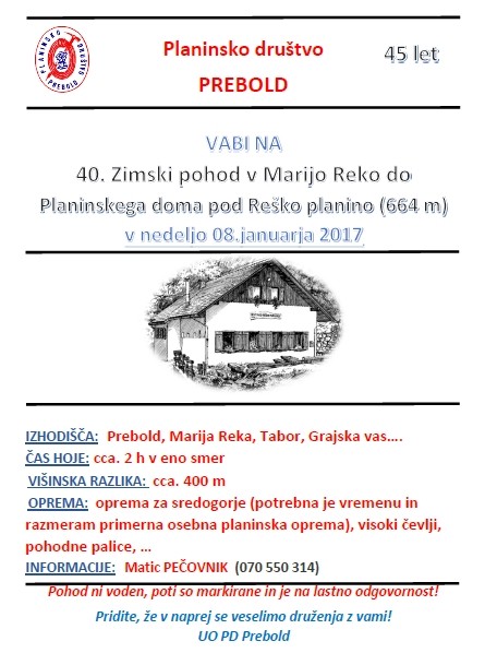 8. 1. 2017 / Pohod, ogledov: 147540. Zimski pohod v Marijo Reko | Vrsta dogodka | Pohod | Območje | Posavsko hribovje | Kdaj | 8. 1. 2017 9.00 | Kje | Prebold | Društvo | Planinsko društvo Prebold | Vodnik / kontakt | Matic Pečovnik / 070 550 314 | Prijave | Matic Pečovnik / 070 550 314 | Informacije | Matic Pečovnik / 070 550 314 | Težavnost | lahka zimska | Pot | Označena pot | Primernost | za vse Primerno za družine | Višinska razlika | 400 m | Trajanje/dolžina | cca. 2h | www.pd-prebold.si |