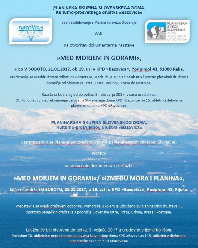 Odprtje razstave Med morjem in gorami | Vrsta dogodka | Kulturna prireditev | Območje | Hrvaška | Kdaj | 21. 1. 2017 19:00, KPD Bazovica | Kje | Reka | Organizator | Kulturno-prosvetno društvo Bazovica |