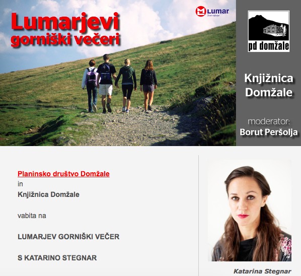 Lumarjev gorniški večer s Katarino Stegnar | Vrsta dogodka | Kulturna prireditev | Kdaj | 7. 2. 2017 19:00 | Kje | Knjižnica Domžale | Društvo | Planinsko društvo Domžale | Gorniški večer bo v torek, 7. februarja 2017 ob 19. uri v Knjižnici Domžale, Cesta talcev 4 v Domžalah. Katarina Stegnar (1976) iz Ljubljane, univerzitetno diplomirana igralka, gibalka, performerka in raziskovalka. Mama hčere, zaposlena v Slovenskem mladinskem gledališču. Ena najbolj vsestranskih ustvarjalk slovenske gledališke umetnosti tako v neodvisni scenski umetnosti kot v institucionalnih gledališčih in na filmu (Barabe (2000), Predmestje (2005), Drevo (2013) in Impromptu (2015)). Članica skupine Betontanc in Beton Ltd. Sodeluje z Gledališčem Glej, Anton Podbevšek Teatrom, SNG Dramo, E.P.I. Centrom, Wax Factory, Plesnim teatrom Ljubljana, Ex-Pontom, Masko … Od leta 2004 ustvarja v Via Negativi. Doslej odigrala prek 70 gledaliških vlog. V drami Pavla nad prepadom (2013) odstre lepoto plezanja in bolečino tovariške izdaje. Nenehno razvija, poglablja in vdira v lastno zaznavo sveta in »je neizprostna tako do sebe kakor do publike«. Prejela je nagrado zlata ptica (2005), nagrado Veljko Maričić za najboljšo mlado igralko na Mednarodnem festivalu malih odrov na Reki, Hrvaška, za vlogo Tjaše v Fragile! (2007) in nagrado Prešernovega sklada (2016). Po uvodni predstavitvi se bo s Katarino pogovarjal Borut Peršolja.