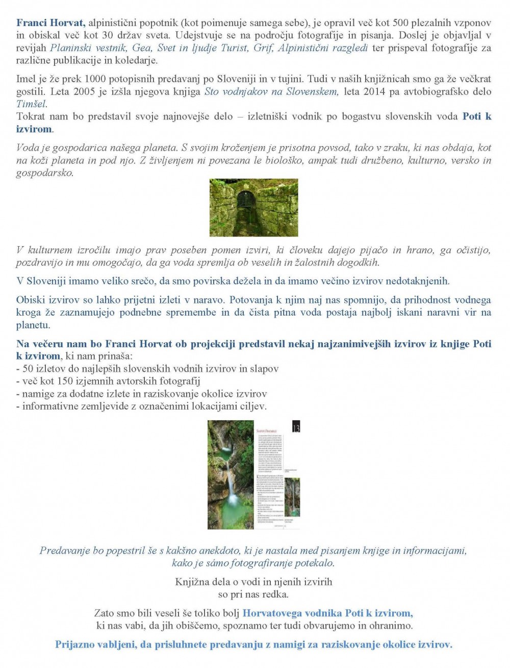 potopisno predavanje POTI K IZVIROM predavatelja Francija Horvata.