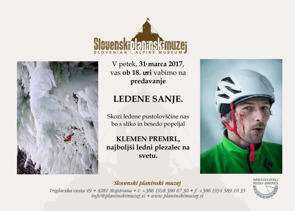 Muzejski večer: predavanje Klemena Premrla | Vrsta dogodka | Predavanje | Kdaj | 31. 3. 2017 18:00 | Kje | Slovenski planinski muzej, Mojstrana | Organizator | Slovenski planinski muzej | Povezava | http://www.planinskimuzej.si/?mod=aktualno&action=viewOne&ID=644 | V petek, 31. marca 2017, vas ob 18. uri vabimo na predavanje Ledene sanje. Skozi ledene pustolovščine nas bo s sliko in besedo popeljal Klemen Premrl, najboljši ledni plezalec na svetu.