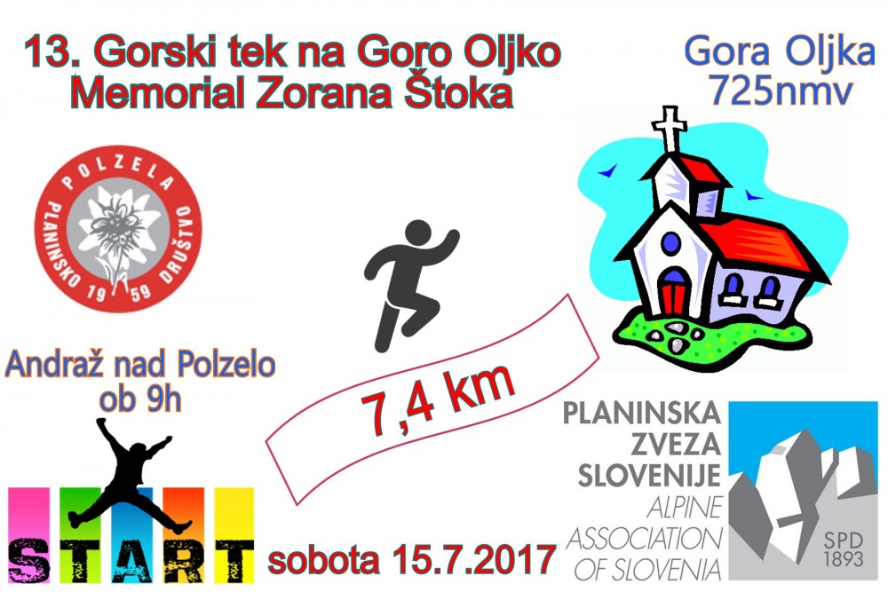13. gorski tek na Goro Oljko - Memorial Zorana Štoka | Vrsta dogodka | Tekmovanje | Kdaj | 15. 7. 2017 9:00, Andraž nad Polzelo | Društvo | Planinsko društvo Polzela | ZBIRNO MESTO: 15.7.2017, štart ob 900, prevzem številk