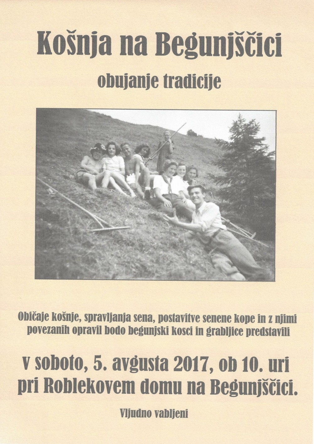 Košnja na Begunjščici | Vrsta dogodka | Kulturna prireditev | Območje | Karavanke | Kdaj | 5. 8. 2017 10:00, Roblekov dom na Begunjščici | Društvo | Planinsko društvo Radovljica | Planinsko društvo Radovljica vsako leto organizira tradicionalno prireditev košnje na Begunjščici. Snoseki so v preteklosti sekli seno po vseh strmih pobočjih Begunjščice, nazadnje leta 1962. S košnjo na Robleku se trudimo ohranjati to tradicijo.