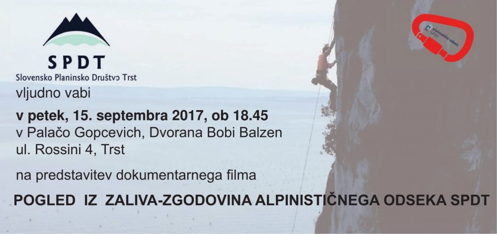 Dokumentarni film: Pogled iz zaliva: Zgodovina Alpinističnega odseka SPD Trst | Vrsta dogodka | Kulturna prireditev | Kdaj | 15. 9. 2017 18:45, Palača Gopcevich, Trst | Kje | Trst | Društvo | Slovensko planinsko društvo Trst | Komisija | Komisija za alpinizem | V okviru Slofesta, ki bo od 15. do 17. septembra v Trstu na Borznem trgu in v njegovi okolici vas vabimo na dogodek, na predstavitev dokumentarnega filma, ki ga je pripravilo Slovensko planinsko društvo Trst.