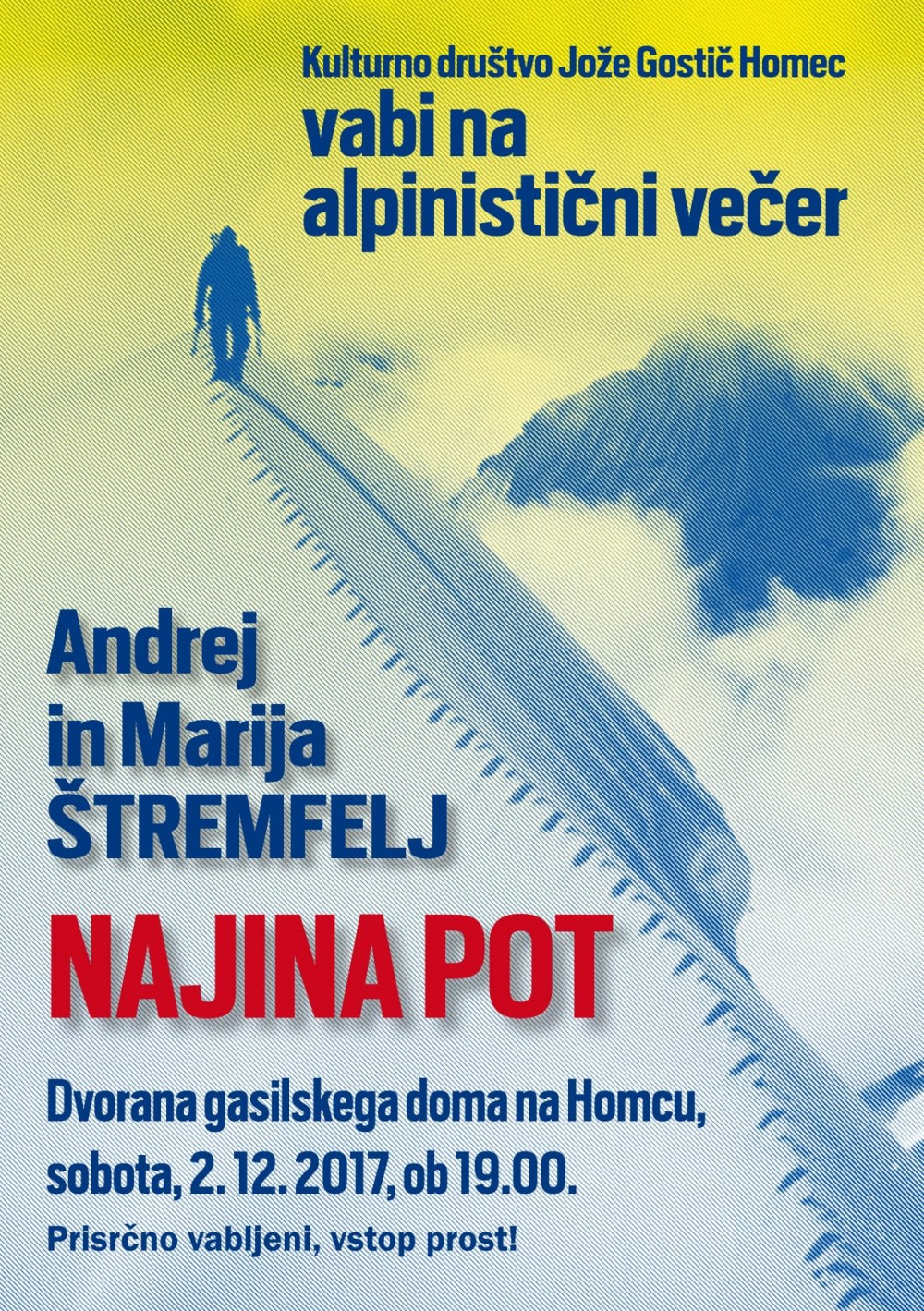 Najina pot - Andrej in Marija Štremfelj | Vrsta dogodka | Predavanje | Kdaj | 2. 12. 2017 | Kje | Homec | Organizator | Kulturno društvo Jože Gostič Homec |