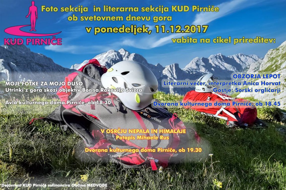 Cikel prireditev ob svetovnem dnevu gora | Vrsta dogodka | Kulturna prireditev | Kdaj | 11. 12. 2017 | Kje | Kulturni dom Pirniče | Organizator | Foto sekcija in literarna sekcija KUD Pirniče |