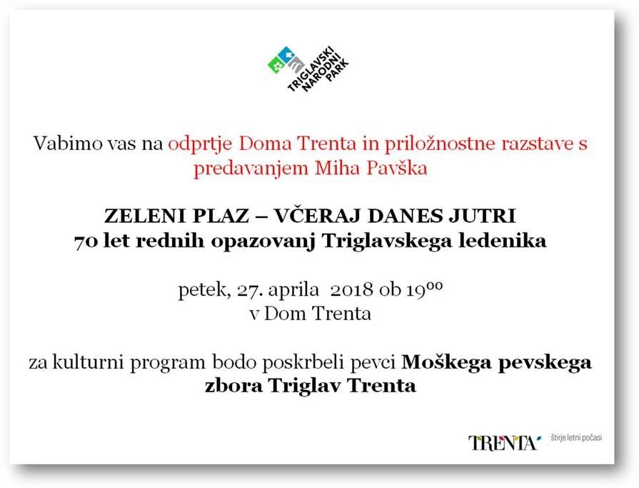 Odprtje doma Trenta in razstave »Zeleni plaz - včeraj, danes, jutri« | Vrsta dogodka | Kulturna prireditev | Območje | Julijske Alpe | Kdaj | 27. 4. 2018 19:00, Informacijski center TNP - Dom Trenta | Kje | Trenta | Organizator | Javni zavod Triglavski narodni park |