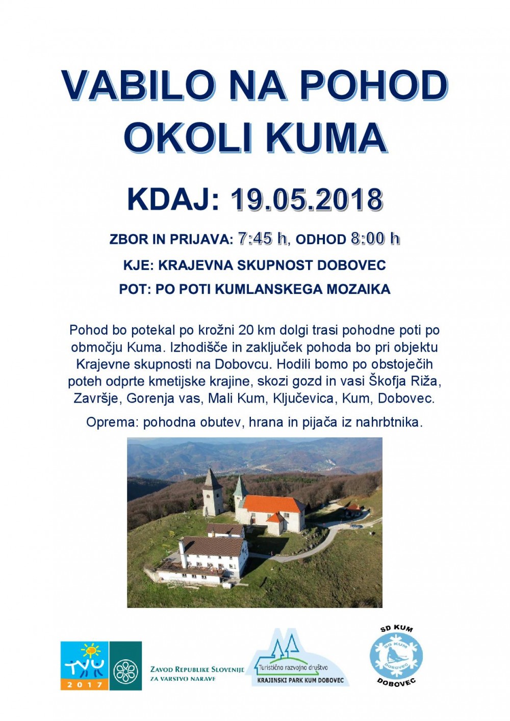 19. 5. 2018 / Pohod, ogledov: 1350Pohod okoli Kuma | Vrsta dogodka | Pohod | Območje | Posavsko hribovje | Kdaj | 19. 5. 2018 | Organizator | TRD Kum | Izhodišče in zaključek krožne tematske poti je pred objektom Krajevne skupnosti na Dobovcu. Nato se podamo po obstoječih cestah in poteh po odprti kmetijski krajini, skozi gozd in vasi. Pretežni del tematske poti poteka po ozemlju občine Trbovlje, delno pa tudi po območju občine Zagorje ob Savi. Prečkamo Škofjo Rižo, Završje, Gorenjo vas, Mali Kum, Ključevico, Kum in Dobovec.