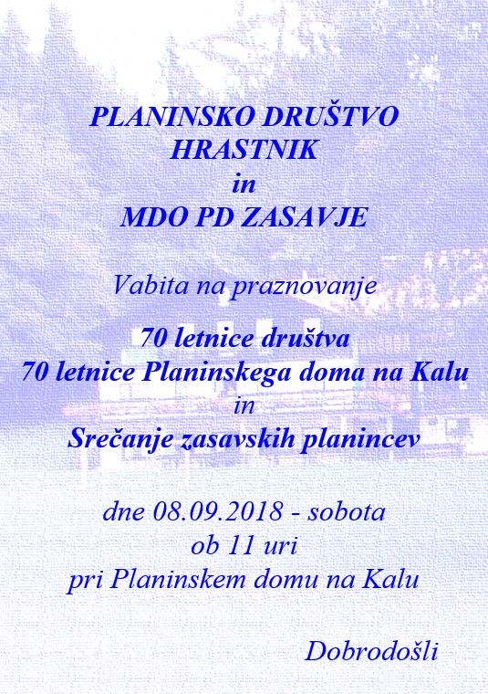 Srečanje Zasavskih planincev | Vrsta dogodka | Srečanje | Območje | Posavsko hribovje | Kdaj | 8. 9. 2018 | Kje | Kal pri Hrastniku | Društvo | Planinsko društvo Hrastnik | MDO PD | MDO PD Zasavja | Primernost | Primerno za družine | Srečanje planincev PD MDO ZASAVJE se bo odvilo v soboto 8. septembra 2018 pri Planinskem domu na Kalu. Ob tem srečanju pa bomo dali poudarek 70. letnici PD HRASTNIK in 70 letnici doma na Kalu.