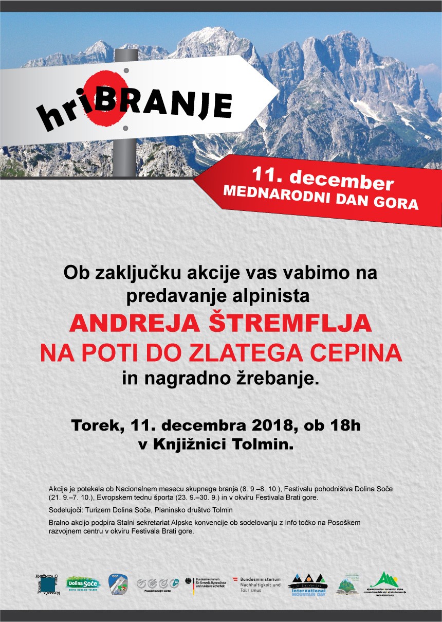 Zaključek akcije hriBRANJE z Andrejem Štremfljem | Vrsta dogodka | Predavanje | Kdaj | 11. 12. 2018 18:00 | Kje | Knjižnica Cirila Kosmača Tolmin | Društvo | Planinsko društvo Tolmin | Povezava | http://www.kcktolmin.si/akcija-hribranje/ |