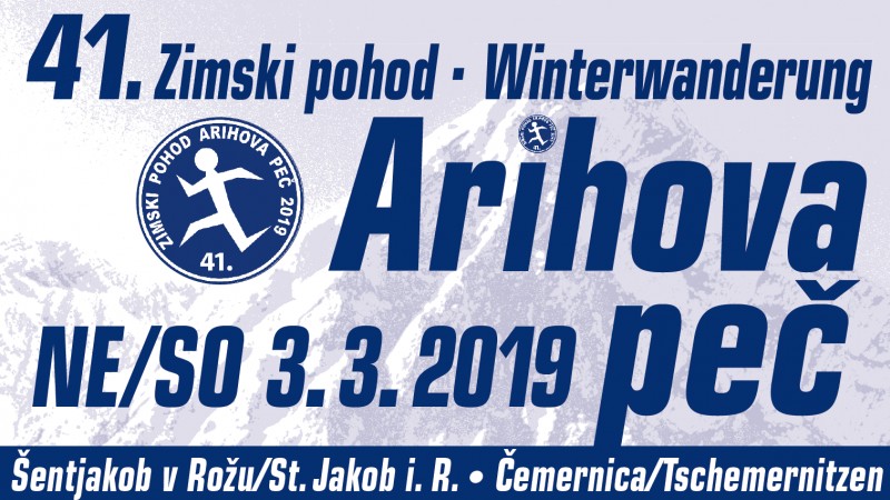 3. 3. 2019 / Pohod, ogledov: 102941. zimski pohod Arihova peč | Vrsta dogodka | Pohod | Kdaj | 3. 3. 2019 | Društvo | Slovensko planinsko društvo Celovec | V nedeljo, 3. marca 2019, vabijo Slovenska športna zveza v Avstriji, Slovensko planinsko društvo Celovec in Slovensko prosvetno društvo “Rož” v Šentjakobu na 41. zimski pohod »ARIHOVA PEČ«. |