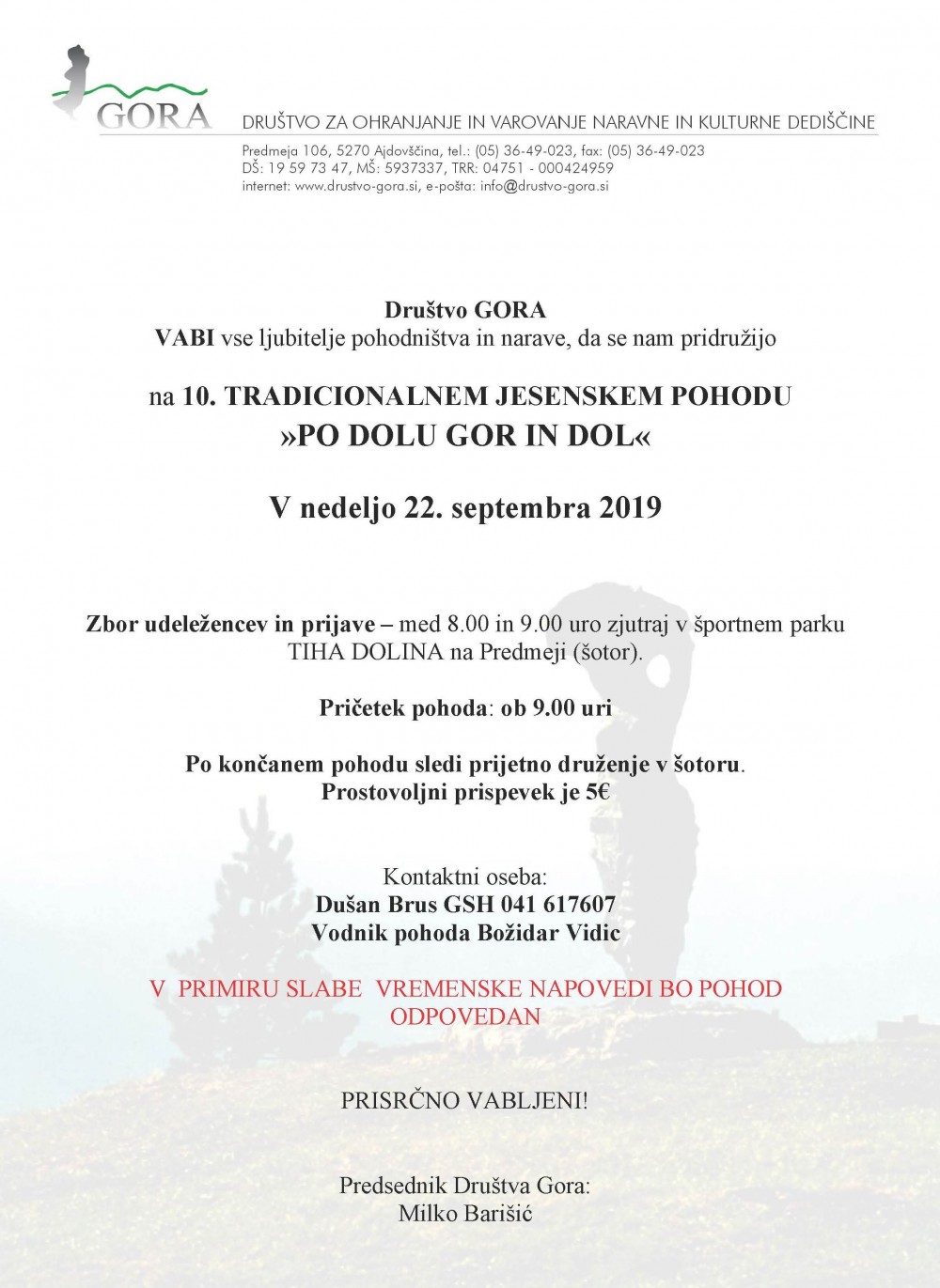 22. 9. 2019 / Pohod, ogledov: 105210. tradicionalni jesenski pohod PO DOLU GOR IN DOL | Vrsta dogodka | Pohod | Območje | Notranjska in Primorska | Kdaj | 22. 9. 2019 09:00 | Kje | Predmeja | Organizator | Društvo Gora | Pot | Označena pot | Primernost | Primerno za družine |