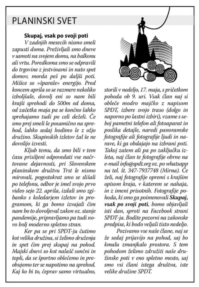 17. 5. 2020 / Pohod, ogledov: 724Skupaj, vsak po svoji poti | Vrsta dogodka | Pohod | Območje | Italija | Kdaj | 17. 5. 2020 9.00 | Kje | Furlanija Julijska krajina | Društvo | Slovensko planinsko društvo Trst | Organizator | Slovensko planinsko društvo Trst | Vodnik / kontakt | 347-7937748 | Prijave | Mirna | Informacije | info@spdt.org | Primernost | Primerno za družine | SPDT vabi na pohod Skupaj, vsak po svoji poti, ki bo v nedeljo, 17. maja ob 9. uri. Člani naj si nadenejo majčko SPDT in naj se napotijo vsak po izbrani poti, med pohodom pa naj fotografirajo. Posnetke pošljite sproti po whatsappu na tel. št. 347-7937748 (Mirna) ali na e-mail info@spdt.org . Fotografije bomo objavili na facebook strani SPDT. |