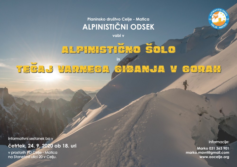Informativni sestanek in vpis bo potekal v četrtek, 24. 9. 2020 ob 18. uri v prostorih Planinskega društva Celje Matica na Stanetovi ulici 20 v Celju.