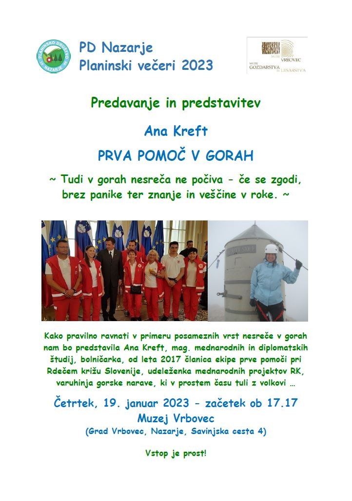 Planinski večer | Prva pomoč v gorah | Vrsta dogodka | Predavanje | Kdaj | 19. 1. 2023 17:17, Muzej Vrbovec, Grad Vrbovec, Nazarje | Kje | Nazarje | Društvo | Planinsko društvo Nazarje | MDO PD | Savinjski MDO PD | Pradava Ana Kreft: