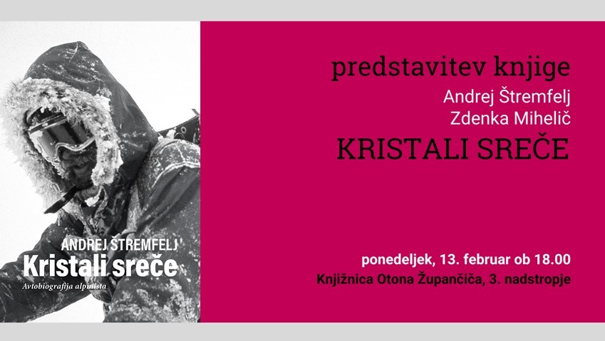Predstavitev knjige Kristali sreče (Andrej Štremfelj) | Vrsta dogodka | Kulturna prireditev | Kdaj | 13. 2. 2023 18:00 | Kje | Ljubljana | Organizator | Knjižnica Otona Župančiča Ljubljana | "Z alpinizmom se ukvarja mnogo ljudi, Andrej Štremfelj pa je en sam," je svežo izdano avtobiografijo legendarnega alpinista z naslovom Kristali sreče pospremila njegova žena, vrhunska alpinistka Marija Štremfelj.