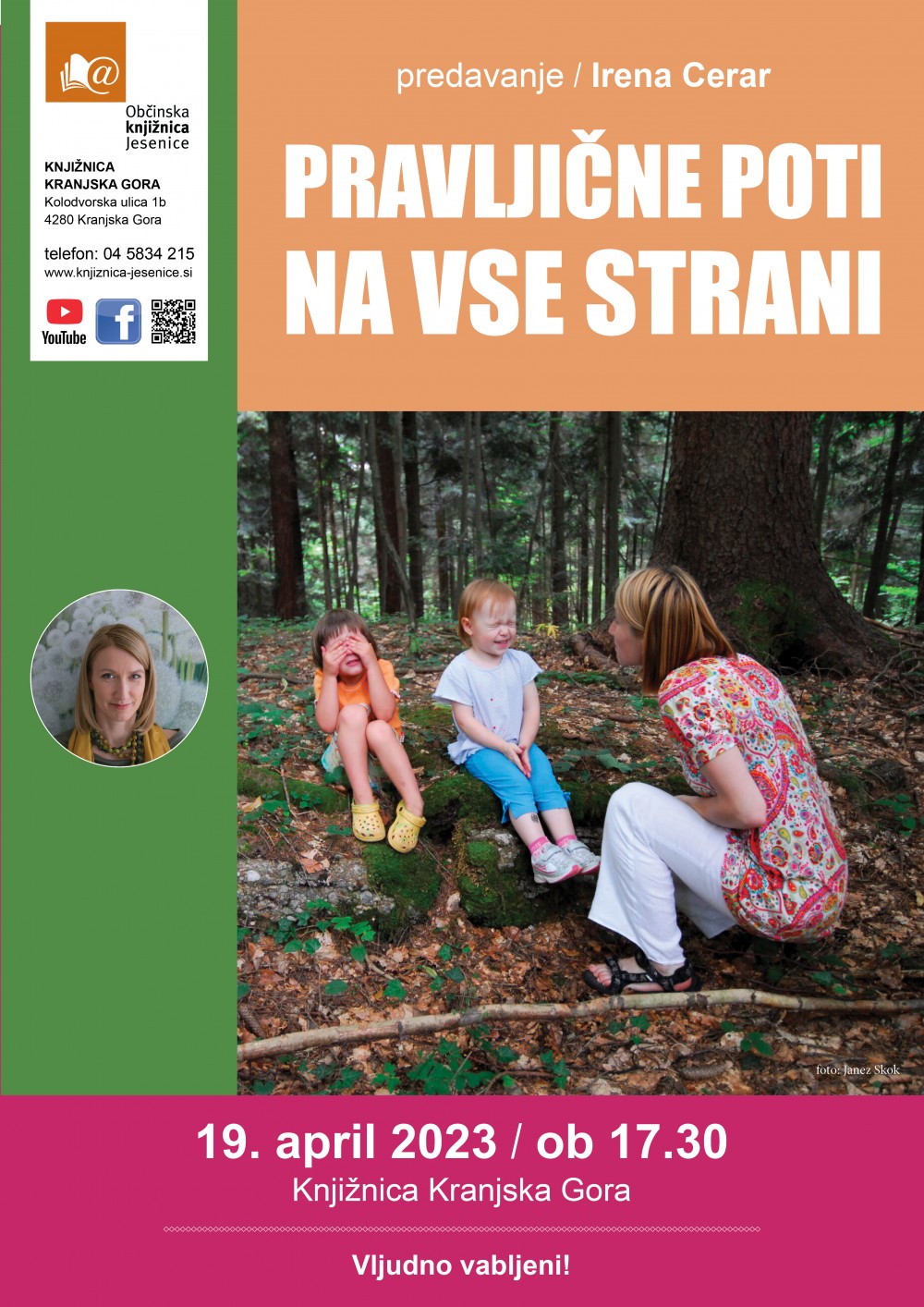 Irena Cerar: Pravljične poti na vse strani | predavanje | Vrsta dogodka | Kulturna prireditev | Kdaj | 19. 4. 2023 | Kje | Kranjska Gora | Organizator | Knjižnica Kranjska Gora |