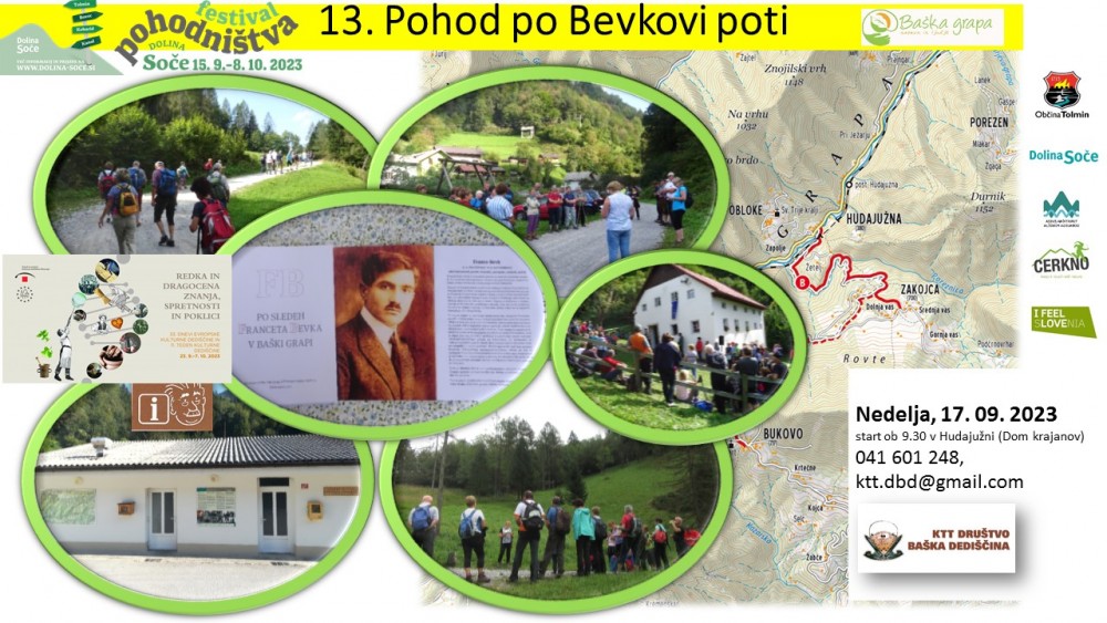 KTT Društvo Baška dediščina letos že TRINAJSTIČ sodeluje pri organizaciji pohoda po Bevkovi poti, ki poteka v okviru vsakoletnih Bevkovih dnevov (soorganizatorji: Zavod za turizem Cerkno, Muzej Cerkno, PD Cerkno, TD pod Kojco, Turistična kmetija pri Flandru). Pohodniki se zberemo ob info točki ob domu krajanov v Hudajužni, kjer se nahaja zemljevid Baške grape in info tabla o Francetu Bevku. V kratkem uvodu predstavimo Baško grapo in info točko v Hudajužni. Na poti proti Zakojci vsako leto beremo odlomke Bevkovih del. Pohod traja urico in pol. Ob prihodu na Bevkovo domačijo, kjer se srečajo pohodniki iz obeh strani, sledi kulturni program. Letos bomo prisluhnili besedi slavnostnega govornika pisatelja Davorina Lenka in ženskemu pevskemu zboru Tice. Po brezplačnem ogledu Bevkove domačije, kjer pripravijo pogostitev člani TD pod Kojco, dan nadaljujejo na Turistični kmetiji pri Flandru, kjer okusijo Bevkovo kosilo. Pohodniki bodo prejeli informacijski list in skozi branje Bevkove besede srečali z literarnimi junaki in njihovimi zgodbami. Tako kot vsako leto bo vsebina informacijskega lista vsebovala odlomke Bevkovih del, ki so povezani s temo Dnevov evropske kulturne dediščine: redka in dragocena znanja, spretnosti in poklici. Prireditev je edinstvena priložnost za povezovanje različnih inštitucij ter ponudnikov, ki delujejo na področju kulturno literarnega turizma.