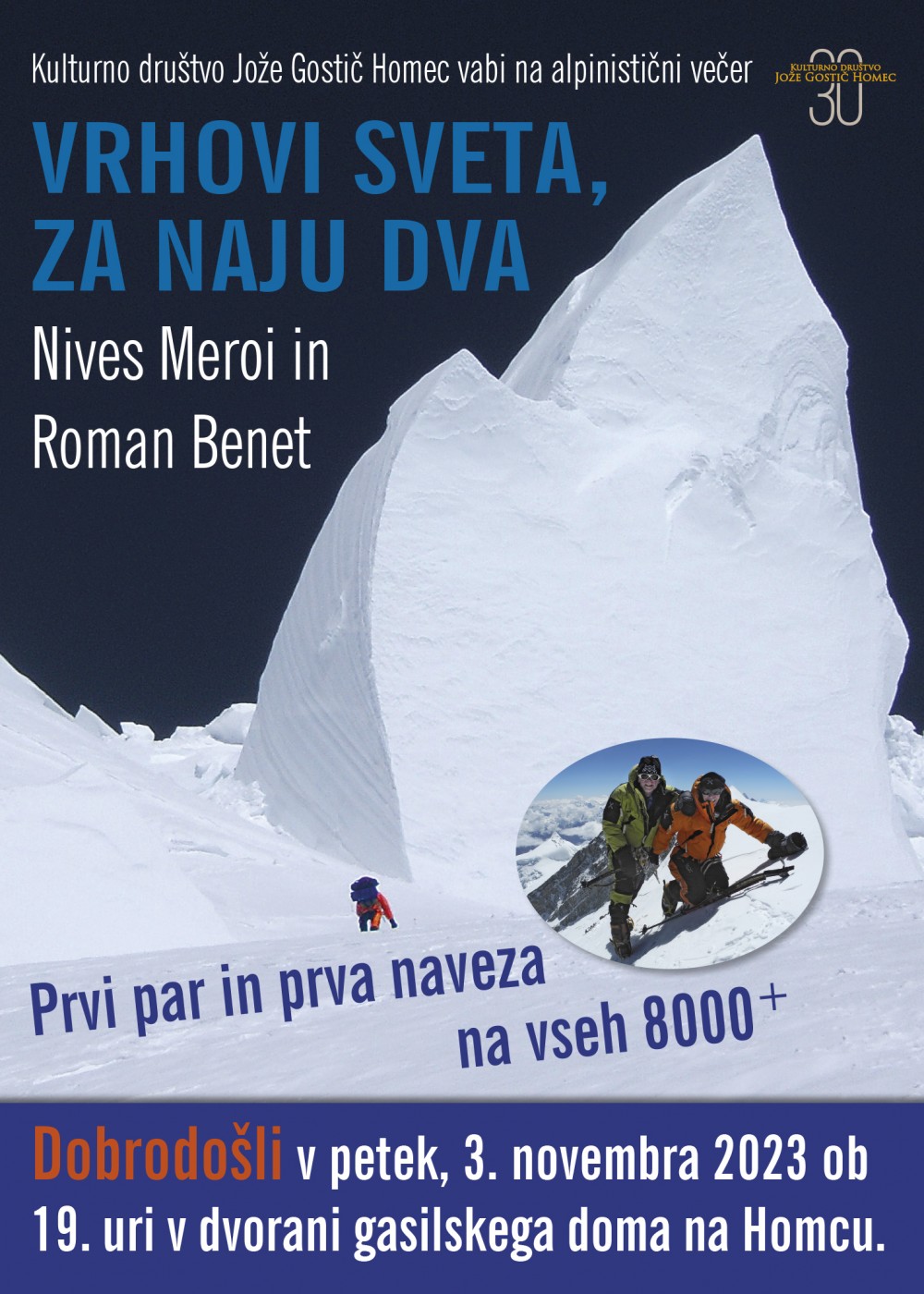 Vrhovi sveta , za naju dva | predavanje Nives Meroi in Romana Beneta | Vrsta dogodka | Predavanje | Kdaj | 3. 11. 2023 | Kje | Homec | Organizator | KD Jože Gostič Homec |