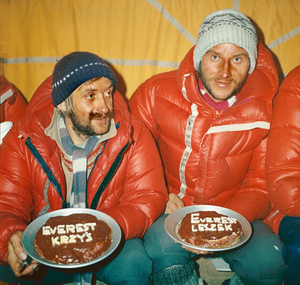 17. februarja 1980 sta ob 14. uri in 25 minut v viharnem vetru pri minus 42 stopinjah Celzija Krzystof Wielicki in Leszek Cichy stala pri kitajski piramidi ter za večno stopila v svetovno zgodovino s prvim zimskim pristopom na Everest. To je bil hkrati prvi zimski vzpon na katerikoli osemtisočak. Oba sta bila člana poljske zlate generacije himalajcev 80. in deloma 90. let, ki se je specializirala na plezanje v koledarski zimski sezoni, v kateri so bili dolgo vodilni. National Geographic jih je poimenoval Ledeni bojevniki. |