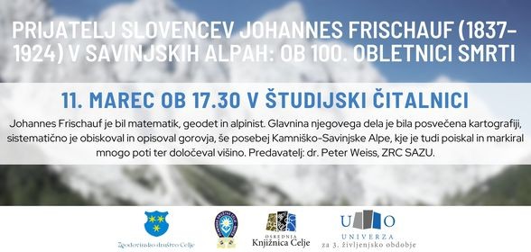 Prijatelj Slovencev Johannes Frischauf v Savinjskih Alpah: ob 100. obletnici smrti | Vrsta dogodka | Predavanje | Kdaj | 11. 3. 2024 17:30 | Kje | Osrednja knjižnica Celje | Društvo | Planinsko društvo Celje - Matica | Povezava | https://www.knjiznica-celje.si/dogodki/item/predavanje-prijatelj-slovencev-johannes-frischauf-1837-1924-v-savinjskih-alpah-ob-100-obletnici-smrti | Vabljeni na predavanje Prijatelj Slovencev Johannes Frischauf (1837-1924) v Savinjskih Alpah: ob 100. obletnici smrti, ki bo 11. marca 2024 ob 17.30 v študijski čitalnici Osrednje knjižnice Celje.