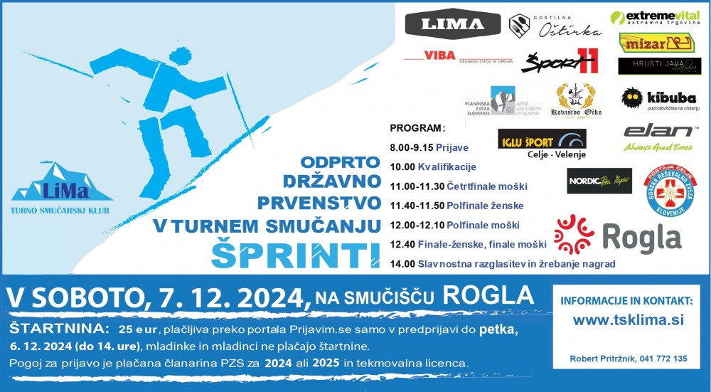 Odprto državno prvenstvo v turnem smučanju - šprinti | Rogla | Vrsta dogodka | Turni smuk | Kdaj | 7. 12. 2024 | Kje | Rogla | Društvo | Turnosmučarski klub LiMa | Odprto državno prvenstvo v tekmovalnem turnem smučanju - šprinti
