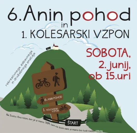 2. 6. 2012 / Izlet, ogledov: 14146. Anin pohod in 1. kolesarski vzpon k Sv. Ani | Vrsta dogodka | Izlet | Območje | Dolenjska in Bela krajina | Kdaj | 2. 6. 2012 ob 14.30 (zbor) pri veterinarski postaji v Ribnici (pri Riku) | Kje | Ribnica | Društvo | Planinsko društvo Ribnica | Organizator | PD Ribnica, Radio Urban, Trim sport-Tomas sport | Informacije | Stane Babič, 041 415 308 | Pot | Označena pot | Primernost | Primerno za družine |  |