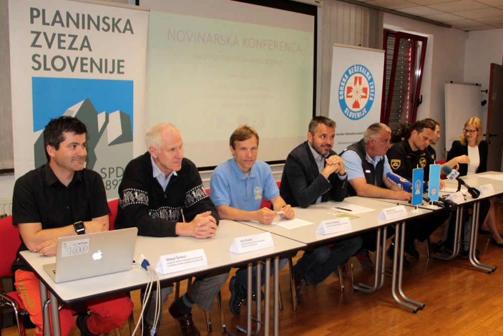 Matjaž Šerkezi, Jože Rovan, Dušan Prašnikar, Matej Planko, Igor Potočnik, Robert Kralj, Anže Čokl in Ana Cergolj Kebler na novinarski konferenci PZS, GRZS in Policije pred začetkom poletne planinske sezone (foto Manca Čujež)