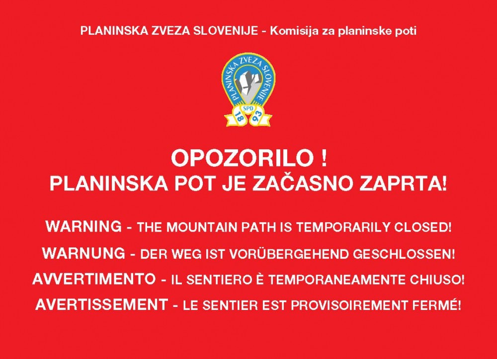 V skladu s 16. členom Zakona o planinskih poteh (Uradni list RS, št. 61/2007) sta Planinska zveza Slovenije in Planinsko društvo Ljubljana-Matica, ki je skrbnik poti, 2. julija obvestila javnost, da bo do nadaljnjega zaprt odsek planinske poti Koča pri Savici (653 m)-Komarča-Črno jezero (1324 m) zaradi poškodb na poti.