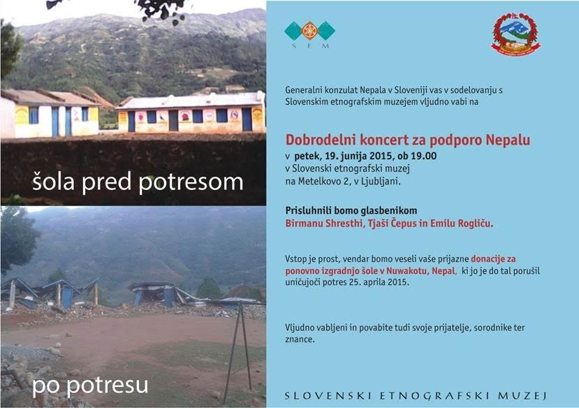 Generalni konzulat Nepala v Sloveniji v sodelovanju s Slovenskim etnografskim muzejem (SEM) vabi na dobrodelni koncert zvočne kopeli za podporo Nepalu, ki bo v petek, 19. junija 2015, ob 19. uri v SEM v Ljubljani. Nastopili bodo Birman Shresta, Tjaša Cepuš in Emil Roglič. Vstop je prost, veseli pa bodo donacij za gradnjo šole v Nuwakotu, ki jo je do tal porušil aprilski uničujoči potres. Vljudno vabljeni!