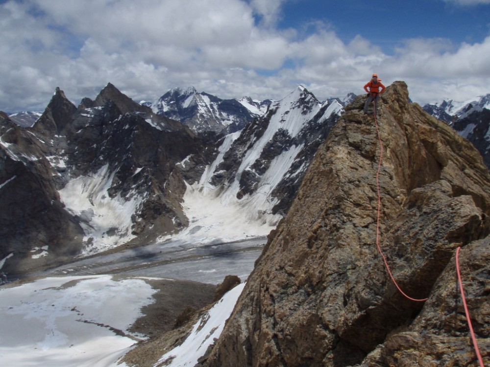 Vzpon na Ri Pok Te Ob prvem poskusu sva bila midva »gremo gor«, vreme pa »gremo dol«. Skregala sva se s pametjo, pa je zmagalo vreme in ne midva, takšna sva. Ob drugem poizkusu smo vsi bili »gremo gor«, celo pamet, ki se ponavadi najbolj upira. Pa sva šla gor v redek zrak in visok zračni pritisk. Evo, končno imava eno smer s skico. Britanci so poskušali (Prinold-Scott leta 2011), pa so narisali skico, Virgil Scott pa je zapisal: »After 200m of scrambling we arrived at the main spur just after sunrise and started moving roped together, occasionally belaying short sections. Most of the climbing was around HS-VS, with the occasional trickier sections. After about 800m of climbing on absolutely superb slabs the spur steepened and we started belaying. At just below 6,000m, with still at least 4-5 long pitches from the summit we noticed dark clouds coming down the valley, then a few wisps of snow began to fall and we decided to descend. After a cold and snowy night on a ledge at around 5,700m we continued the descent the following day.« Še dobro, da ni Kitajec, da ga vsaj malo razumemo. Kaj pa midva? To je bila pa čista poezija. Nekje na sredini prvega dne je Nastjo prešinilo »sedaj pa vem, kaj pomeni absolutely superb slabs«. Pa naj še kdo reče, da plezanje ni univerzalni jezik, še Rusi ga razumejo. Ko se sonce skrije za greben, je zračni pritisk še vedno visok, pritisk na palce v najinih plezalkah pa pripomore, da se odločiva za počitek. Hrana, spanje, luna, prdenje in sanje. Drugi dan … Drugi dan … Ej, drugi dan začneva plezati, ko se dovolj ogreje. Zopet smo vsi »gremo gor«. Zlati odsev nevidnih granitnih niti, stkanih iz globin Matere Zemlje, naju vleče proti modremu nebu. Modrina je tako čista, da se zdi, da bova vsak hip ugledala zvezde. Od sonca ožarjena skala je topla, prijetna za prijem. Potem pa priplezava na jugozahodni greben in poezije je konec. Vse kaže, da sva izvisela. Nadaljevanje po grebenu zgleda težavno in komplicirano. Že R. Cassin je ugotovil, da prečke niso slaba stvar. Tudi midva prečiva rahlo navzdol po polici na drugo stran gore, v zahodno steno, v vznožje velike zajede. Osemdeset metrov plezanja naju pripelje nazaj na jugozahodni greben v škrbino z oknom, od tu pa po jugozahodnem grebenu do vrha. Dragi Aljaž (Tratnik), če ne prej, sva na sestopu res veliko mislila nate. V baznem taboru sva se s težavo prebudila iz zamaknjenosti po opravljeni turi in začela preštevati. Na koncu sva se odločila, da je bilo dvajset spustov po vrvi. Vrv se je zataknila le enkrat, no, pravzaprav dvakrat na istem abzajlu. Ker nikoli nisva bila posebno hitra, sva morala tam nekje po osmem spustu malo počivati. Noč je bila mrzla, kratka in čudovito jasna. Opravila sva prvi pristop na vrh visok 6210 m. Domačini vrh imenujejo Ri Pok Te. Pomen imena je: vrh, ki zakriva ostale vrhove, vrh iz katerega se vidi na drugo stran. Meniva, da je to vrh, ki ga je Sakamoto na skici pogorja Raru označil z R4. Plezala sva v alpskem stilu. Za vzpon sva izbrala vzhodni steber v vzhodni steni, pod vrhom sva se vzpenjala tudi po zahodni steni in jugovzhodnem grebenu. Ime smeri: From East to West (Od vzhoda do zahoda). Splošna ocena smeri je po najinem mnenju TD+/ED-, dolžina smeri 1200 m, višinska razlika med vstopom in vrhom cca 1000 m. Skalna smer, težave od 3 do 6 - UIAA. Celo smer sva preplezala v plezalkah (v čevlje sva se preobula za sestop), derez nisva uporabila, cepin pa nama je prišel prav za nabiranje snega, ki sva ga topila v vodo.