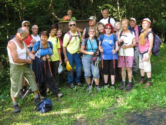 Kot običajno je pohodnike na vrhu Pomjana v prijetni senci visokih topolov, pričakala prijetna planinska pogostitev in osvežitev s strani družine Lovrečič in gospe Bernarde, pokojnikove žene. Po prijetnem klepetu in pesmi, so se pohodniki vrnili v dolino po krožni poti mimo vodnega vira Škladič, kjer so s pesmijo proslavili ureditev vodnega vira in se nato po novo dogovorjeni trasi poti, bolj proti Kampelu, vrnili v dolino, na izhodišče poti in se izognili nevarnemu predelu ob potoku.