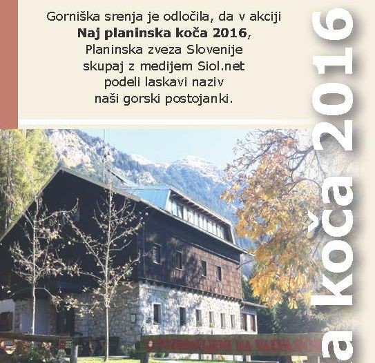 Gorniška srenja ja odločila, da v akciji Naj planinska koča 2016 Planinska zveza Slovenije skupaj z medijem Siol.net podeli laskavi naziv Valvasorjevemu domu pod Stolom. Ob tej priložnosti bodo v soboto, 24. septembra, od 11. ure dalje pred Valvasorjevim domom zaigrale vesele note ansambla Dor ma cajt, na oltar človeške kulinarike pa bodo postavljene dobrote iz Valvasorjeve kuhinje. Vabljeni!