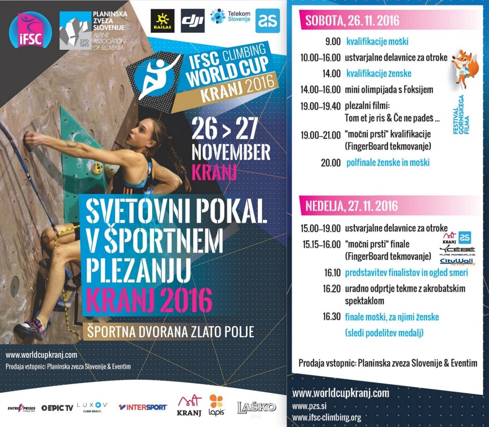 Le še dva dneva nas ločita od športnoplezalnega spektakla leta - zaključne tekme svetovnega pokala v športnem plezanju Kranj 2016. Že ogrevate dlani in glasilke za glasno spodbujanje naših junakinj in junakov? Smelo pričakujejo sklepno dejanje bleščeče sezone in na domačih tleh si res zaslužijo našo močno podporo v živo.