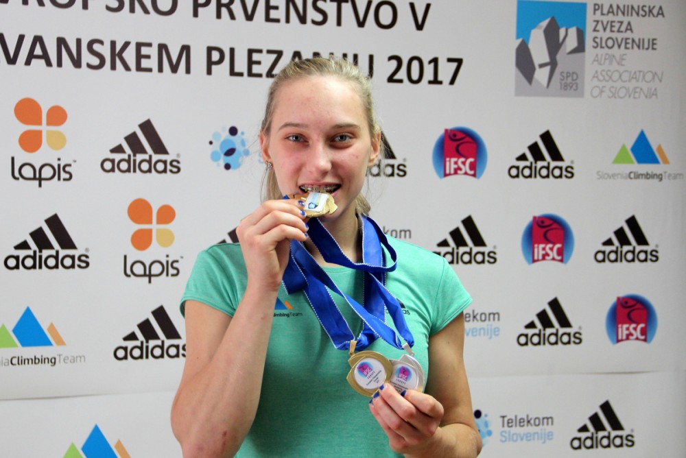 Janja Garnbret evropska podprvakinja v balvanih in zlata v kombinaciji, Anže Peharc tretji Osemnajstletna Janja Garnbret je na evropskem prvenstvu 2017 v balvanskem plezanju 19. avgusta v superfinalu osvojila srebrno medaljo in si z njo zagotovila tudi zlato v kombinaciji prvenstva stare celine, 20-letni Anže Peharc pa si je v Münchnu priplezal bronasto odličje. Slovenska reprezentanca v športnem plezanju je skupaj z julijskim srebrom Mine Markovič v težavnosti tako na letošnjem evropskem prvenstvu osvojila štiri medalje. >>> več