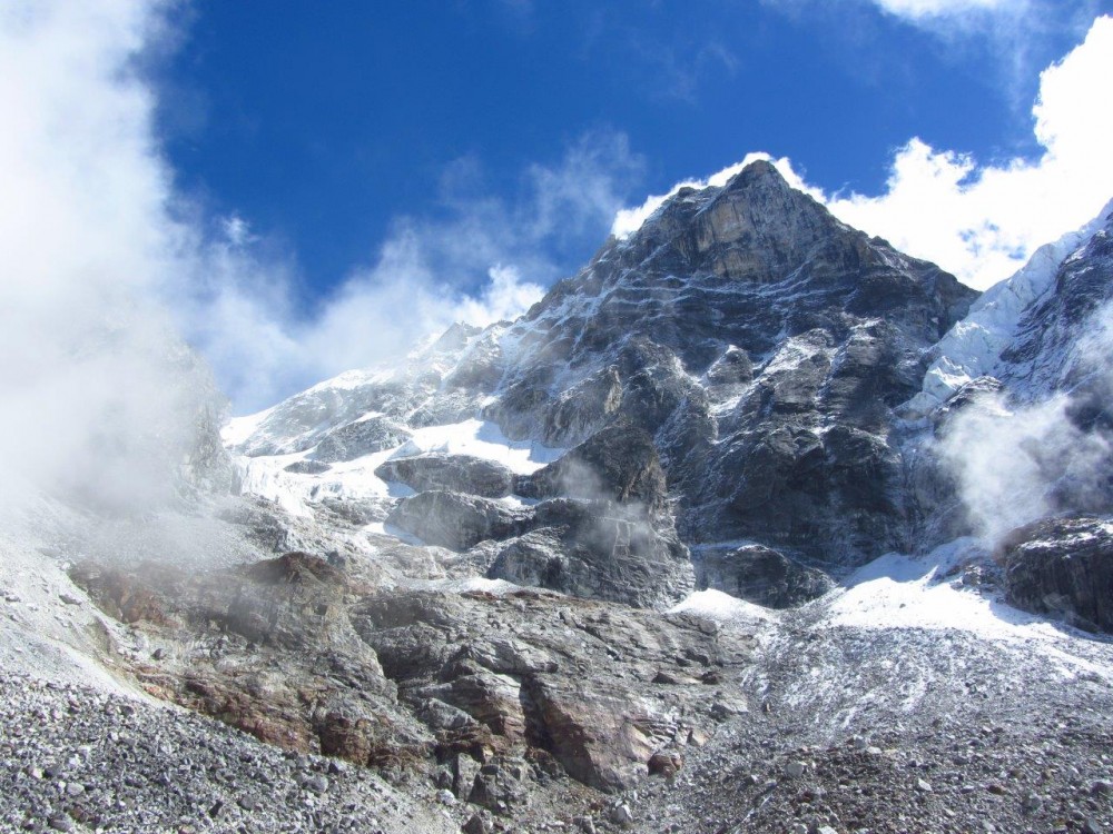 Za začetek naju je pozdravil pogled na steno, ki je le tu pa tam premogla kaj snega. Nič kaj podobno fotografiji v najinih rokah, ki sem jo posnel leta 2008. Naivno sem se slepil, da se v Himalaji podnebne spremembe ne poznajo tako močno, kot drugje po svetu. Kako nisem pomislil na to možnost, ko sem doma ure in ure buljil v sliko in iskal prehode? Južna stena Lungaretseja je bila popolnoma kopna, zahodna stena Kyajo Rija pa je premogla le tri ledno-snežne trakove. Precej tanke. Dva od njih sta se kasneje izkazala za neuporabna, saj je sonce že obračunalo z njima. Pod steno pa so se bohotili kupi in kupi balvanov, kamenja in šodra, ki naju je čakal, preden bi sploh nadela dereze in prijela za cepine. Kaj češ, je že moralo tako biti.