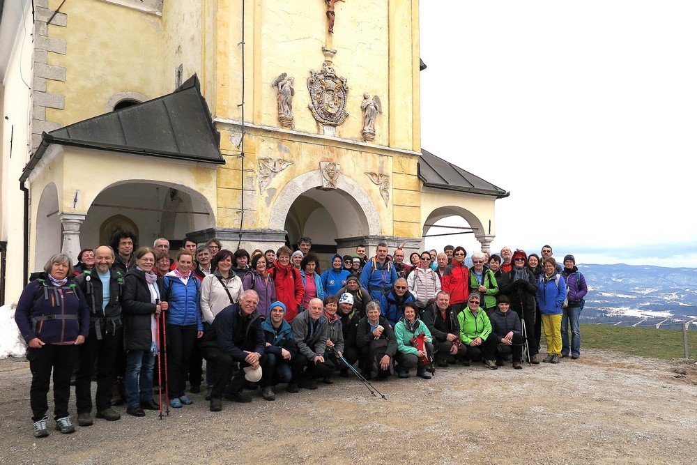 Kljub oblačnemu in vetrovnemu vremenu smo sproščenih obrazov in lahkih nog med vinogradi in zidanicami zakorakali proti razglednemu vrhu. Med hojo po delu Trdinove poti smo se večkrat ustavili. Vodnica Rozi nam je na postankih podrobno in ponosno opisala ta lep košček dolenjske gričevnate pokrajine, dom glasbene legende Lojzeta Slaka in ansambla Henček ter nanizala podrobnosti o zgodovini in življenju v teh krajih, reki Krki, ... Izčrpno nam je predstavila tudi delo odbora VGN Dolenjske in Bele krajine, ki že vrsto let vzgaja mlade gorske stražarje ter izrazila željo, da bi vsak planinec opravil tečaj za gorskega stražarja. Sicer je Dolenjska zaznamovala tudi Janeza Trdino, ki je med drugim spisal Bajke in povesti o Gorjancih, ki jih vsi poznamo, že Valvasor pa je pisal o cvičku s Trške gore. Na vrhu pred romarsko cerkvijo in štirimi res debelimi lipami (ena od njih v prsnem obsegu meri 830 cm in je proglašena za najdebelejšo lipo na Dolenjskem) je sledil še kratek postanek za skupno fotografiranje.