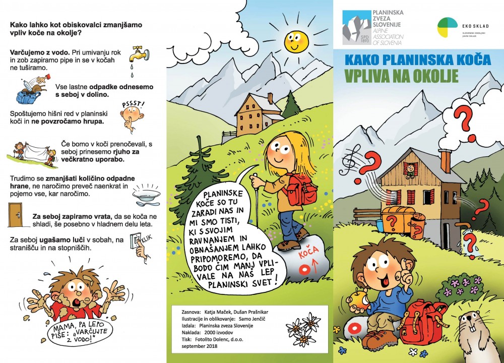 Poučna zgibanka, ki je namenjena predvsem mlajšim osnovnošolcem, ob prikupnih ilustracijah nazorno prikazuje delovanje planinskih koč in njihov vpliv na okolje - skozi prizmo odpadkov, odpadne vode, hrupa in onesnaženja zraka - ter podaja preprosta navodila, kako lahko kot obiskovalci zmanjšamo vpliv koče na okolje. Ogledate si jo lahko na spodnji povezavi!