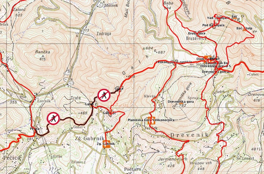 - po planinski poti Zg. Gabrnik - Galke - Planinski dom na Boču ali