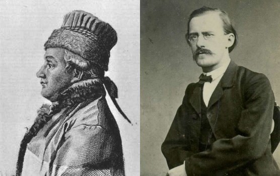 Levo Balthasar Hacquet, v sredini njegovo delo Abbildung und Beschreibung der südwest- und östlichen Wenden, Iliryer und Slaven. Desno Radicsevo delo Bergfahrten in Österreich Einst und Jetzt 1363-1887.