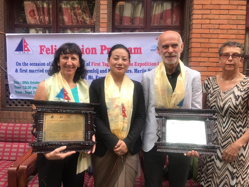 Marija in Andrej Štremfelj sta v Katmanduju prejela priznanje Planinske zveze Nepala (foto arhiv Aswina Shresthe)